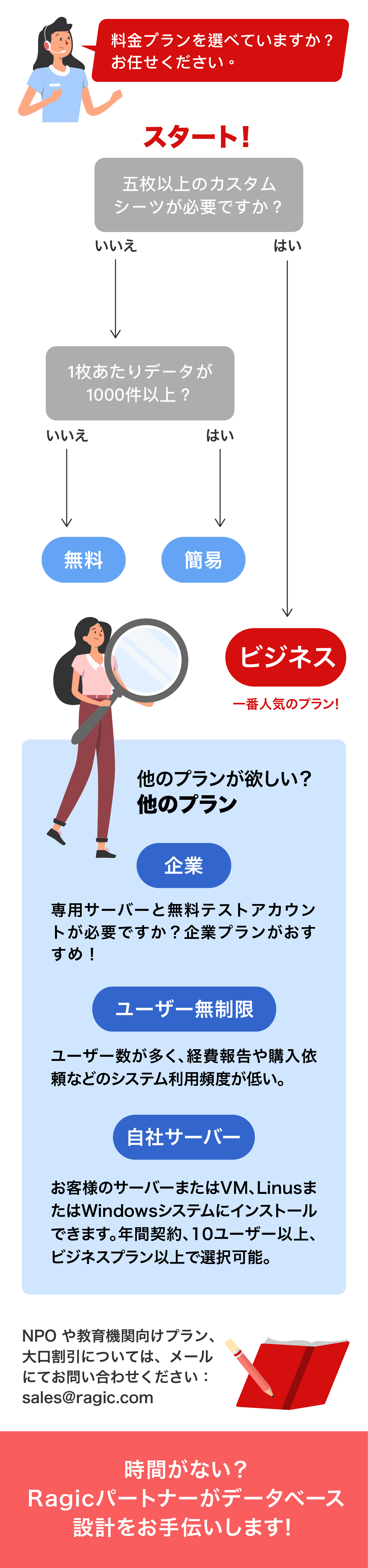 Ragicでは月ごとのお支払いと1年ごとのお支払いの2つの方法をご用意しています。ユーザー数やプランはいつでも変更できます。期間中にプランを変更した場合は、残りの日数に応じて次回の請求書に加算または減額させていただきます。