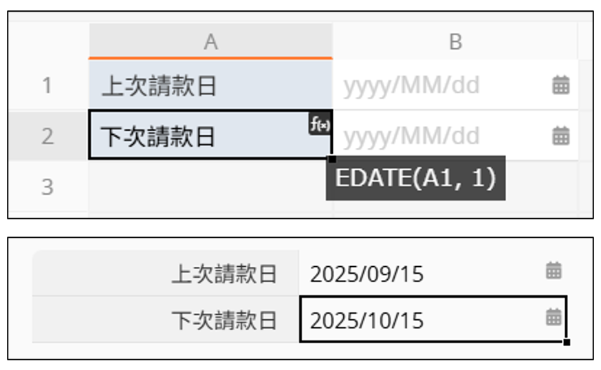 若每月 15 日需請款,可在「下次請款日」欄位輸入公式:EDATE(「上次請款日」欄位, 1),系統將自動計算出下一次請款日期。