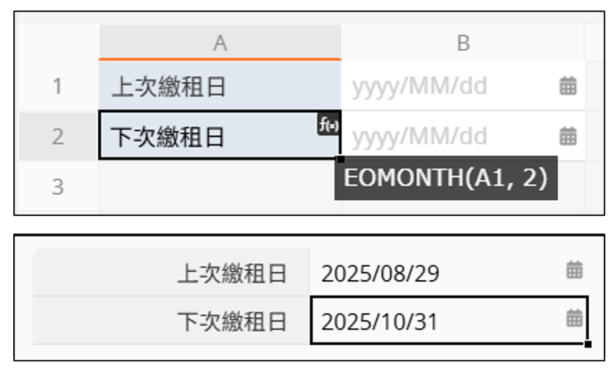 若租賃合約每兩個月繳一次租金,可在「下次租金到期日」欄位輸入公式:EOMONTH(「上次繳租日」欄位, 2),系統會自動計算出下一次租金的月底截止日,方便財務與客服人員及早通知。
