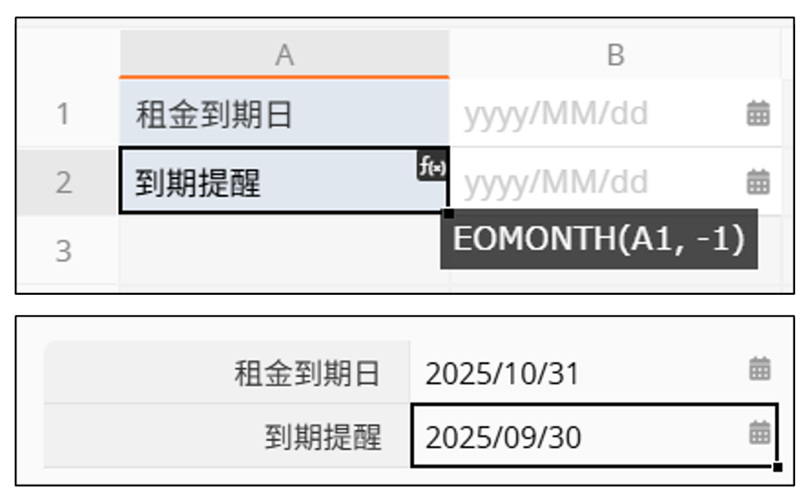 若租賃合約每月月底到期,公司希望提前一個月提醒,可在「到期提醒」欄位輸入公式:EOMONTH(「租金到期日」欄位, -1),系統將計算出前一個月的月底日期,用於提前安排通知與準備工作。