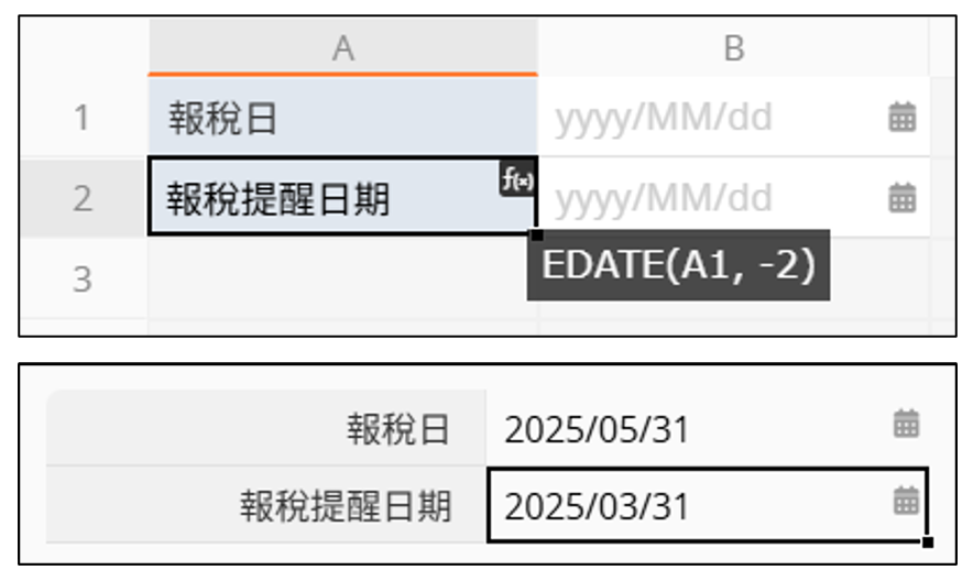 若公司報稅需提前準備,可在「報稅提醒日期」欄位輸入公式:EDATE(「報稅日」欄位, -2),系統會計算出報稅日往前兩個月的日期,方便及早安排相關作業。
